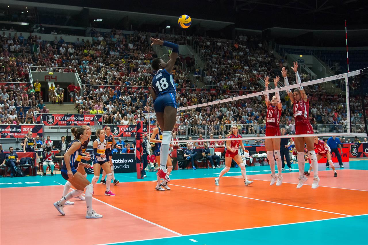 Italy and Slovakia will face each other for the first time in a major event. Italy, defeated only by Poland in the Pool phase, is the favourite team and it can count on Paola EGONU, one of the best opposite of the tournament, but Slovakia has, on its side, the cheering supporter of Bratislava: after an historical qualification to the eighth-finals of EuroVolley, the fans wants more.