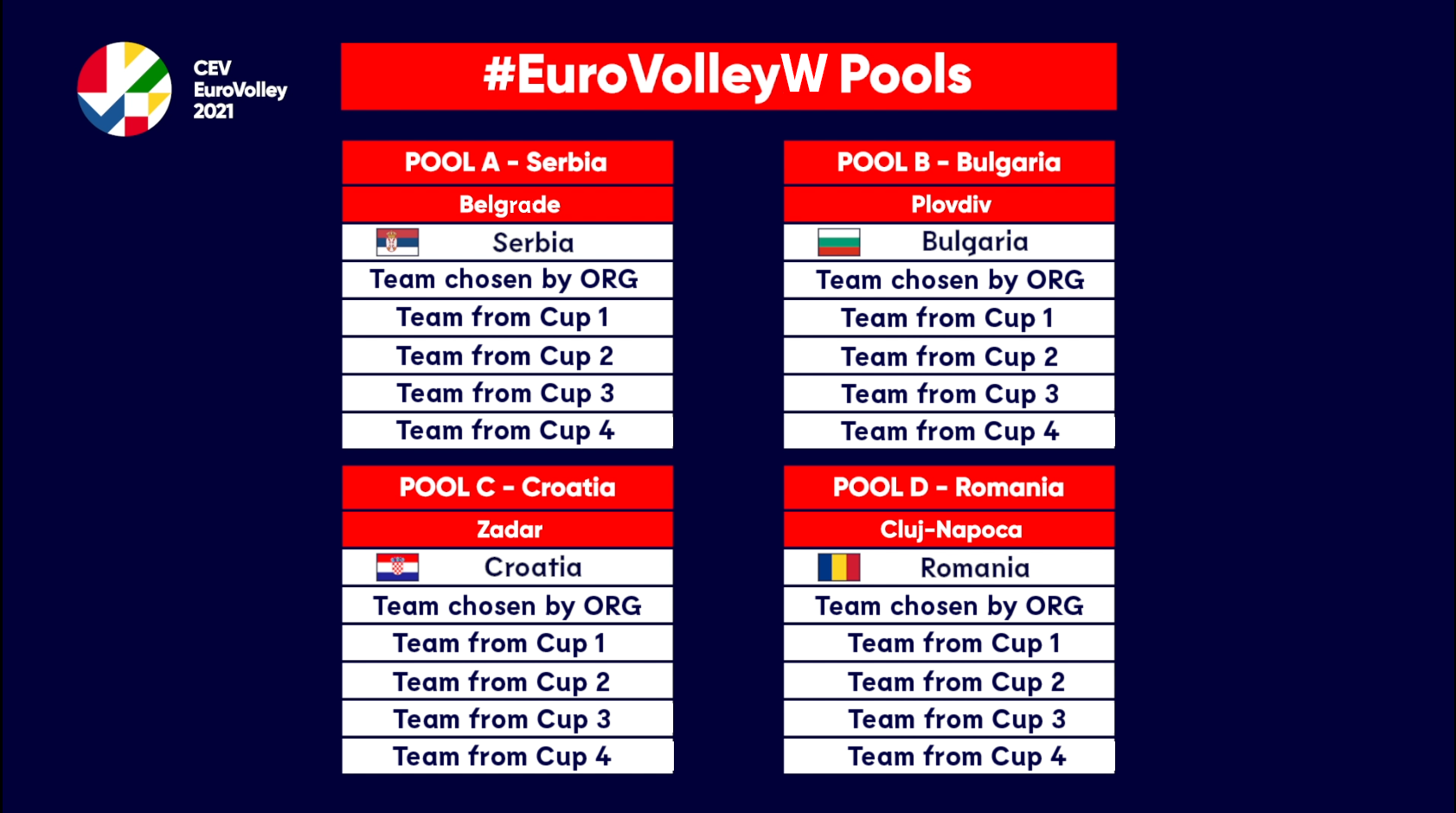The CEV EuroVolley 2021 Women will run from August 18 to September 4 in Serbia, Bulgaria, Croatia, and Romania, with Belgrade playing host to the Pool A matches, four 8th and two quarterfinal matches as well as to the semis and medal matches. Plovdiv, Bulgaria, will host Pool B plus four 8th and two quarterfinal matches. Zadar (Croatia) and Cluj-Napoca (Romania) will be playing host to the Pool C and Pool D matches, respectively.